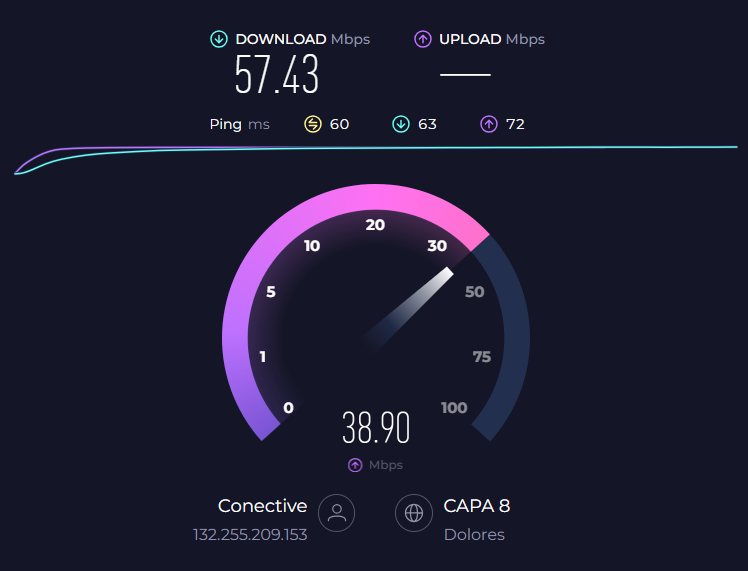 Una vez que comienza la prueba, la interfaz muestra indicadores gráficos que representan la velocidad de descarga y carga: